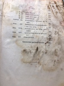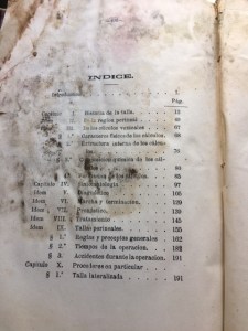 Indice de la obra «De las tallas perineales y del cateterismo perineal forzado». Año 1867