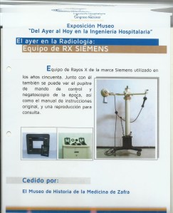 D. José María Pagán Pagador, decide organizar en los actos paralelos del congreso una Exposición que titula “Del Ayer al Hoy en la Ingeniería Hospitalaria” con piezas del Museo de Medicina de Zafra. Se realizan las gestiones oportunas y los estudios necesario y se organiza la exposición. Se seleccionaron más de 40 aparatos e instrumentos del Museo de Historia de la Medicina de Zafra. Se realizó un estudio pormenorizado para crear carteles documentados de las piezas y se contrastaba el aparato antiguo de medicina con el formato actual para ver las diferencias que existen del aparato antiguo con el que se utiliza en la actualidad.