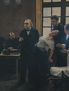 Charcot realizando una hipnosis en una paciente histérica pintado por André Brouillet, Cuadro muy famoso y reproducido en numerosos textos.