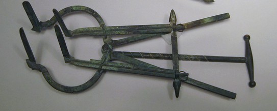 Este espéculo es tipicamente rectal, tambien puede considerarse y llamarse un separador, no obstante es un instrumento para inspeccionar, ver cavidades humanas. Fue encontrado al lado de los anteriores por lo que no tiene duda que era instrumental médico. Puede parecer unas tenazas o pinzas, pero el sistema central de articulacion hace que al apretar los mangos, se separen las brazos o vástagos superiores. Como este ejemplar existe uno en Cuenca que lo han catalogado como espéculo vaginal