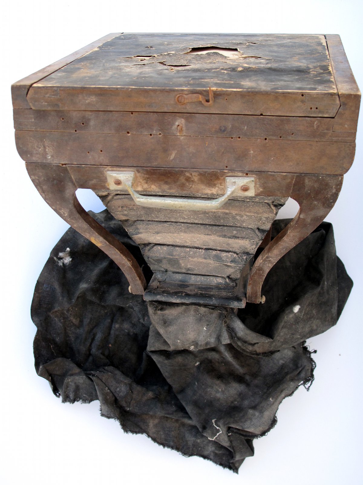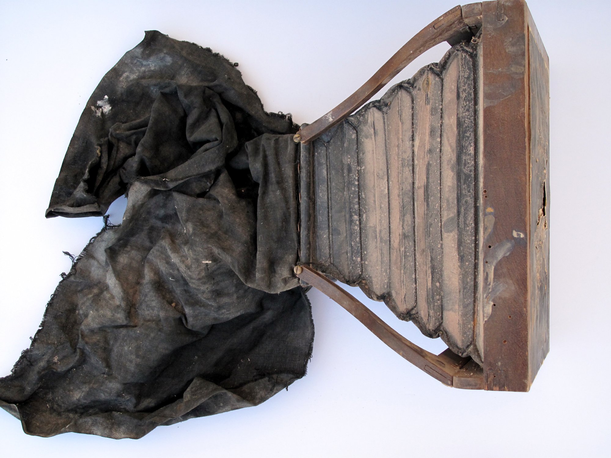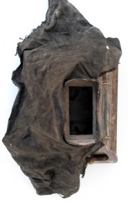 La pantalla es simple como puede verse en la imagen. Consta de un cuadro central de 20 por 15 cms. que es la pantalla propiamente dicha y una tela fijada al perimetro de la pantalla para generar una zona obscura para el observador.