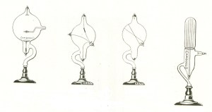 Tubos de Crookes. Diferentes modelos fabricados por Mónico Sánchez Moreno en su fábrica de “Eléctrico Sánchez” de Piedrabuena (Ciudad Real) fabricó y distribuyó estos tubos para los Departamentos de Fisica y Quimica de las Universidades Españolas y de los Institutos de Enseñanza Secundaria. Funcionaban con su “Aparato Sánchez” de corriente de alta frecuencia.