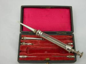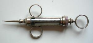 La famosa casa de fabricación de instrumentos médicos Charriére, de Fréderic Charriére (1803-1876), la fabrica para todo el mundo.  En principio de metal y posteriormente de cristal, el pistón  era de de plata y tiene una placa de cuero que sirve para ajustarse al tubo de la jeringa e introduce la innovación del corte en bisel del trocar o aguja metálica