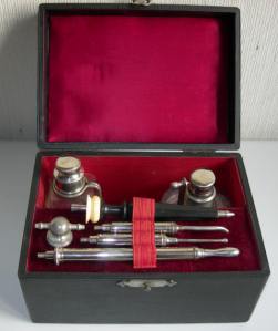 Primero se calentaba mediante una lámpara de alcohol el cauterio y para elevar la temperatura se hace funcionar un insuflador conectado a un frasco con bencina que mantiene caliente al rojo el termocauterio. Todo el instrumental estaba colocado en una caja con todos los elementos.