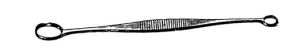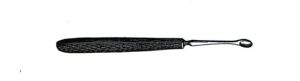 Es una doble cucharilla fenestrada. Mango recto, estriado en el centro para evitar deslizamientos en la intervención. Tenía diferentes diámetros las cucharas para tener dos en un mismo instrumento