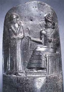 Parte superior del Codigo de Hammurabi donde puede verse a Hamurabi de pie y el Dios Smash
