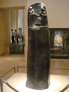 El Código de Hammurabi está grabado en una estela de diorita de 2,25 metros de altura. En la zona superior esta representado Hammurabi en bajorrelieve de pie, delante del Dios de la Justicia y del Sol en la Mesopotamia de entonces, el dios “Smash”