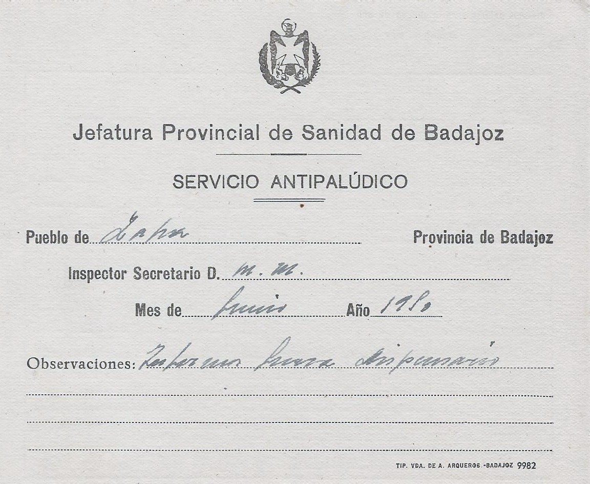 Ficha Antipalúdica. Año 1950 Deja un comentario Ficha Antipalúdica. Año 1950 Fichas realizadas por D. Manuel Mártinez Marin Jefe de Sanidad Local de Zafra. Año 1950 Portada de la Ficha Antipalúdica. Año 1950 Contraportada de la Ficha Antipalúdica. Año 1950