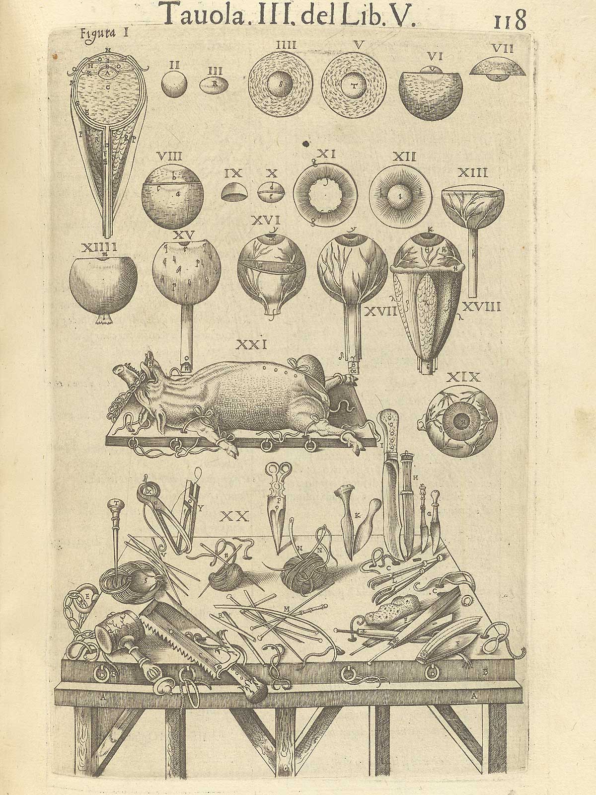 Al final pone los intrumentos o herramientas que usaban los anatomistas para la disección. Es curioso lo rudimentario de los instrumentos para realizar tan excelentes disecciones y poder conseguir el dibujante realizar las mágnificas láminas con precisión de arterias, venas, musculos, huesos, visceras y nervios.