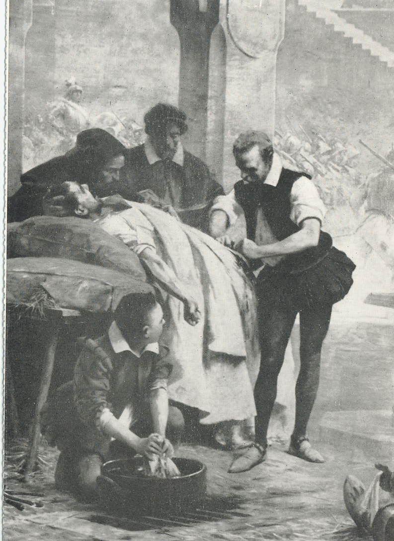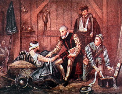 En aquella época las armas de fuego eran disparadas a distancias muy cortas debido a su corto alcance. Este hecho hacía que las heridas estuvieran rodeadas de pólvora. Los textos clásicos de Medicina de Galeno, Celso no contemplan esta heridas porque la pólvora no existía. La opinión generalizada era que la pólvora envenenaba la herida y para tratarla se utilizaba aceite de saúco.