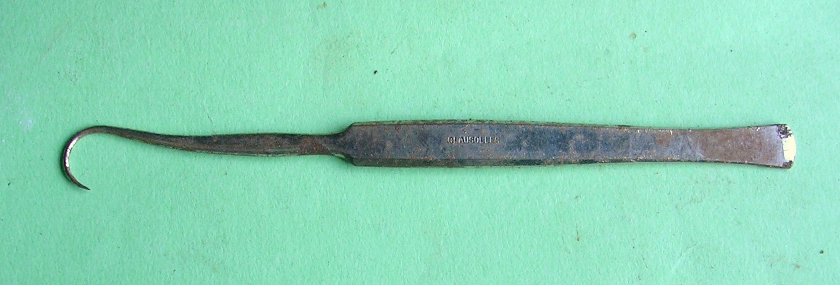 Es un instrumento que consta de mango y parte metálica en forma de gancho que termina en punta afilada, parecido a una aguja curva con mango. Es sencillo y simple por consiguiente fácil de fabricar por cualquier artesano. En muchos textos se encuentra también la palabra tenáculo como sinónimo de forceps o pinza.