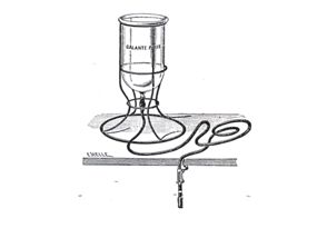 Tenía un recipiente de cristal con un orificio en el fondo. Y una estructura de alambre para su colocación en posición vertical. El tubo de cristal permanecía abierto por su parte superior por si se deseaba reponer líquido en el recipiente, de esta forma se podía realizar irrigaciones de una forma continua y durante largo tiempo. Por lo demás el otro extremo era de goma que finalizaba en una cánula para la introducción en vagina.