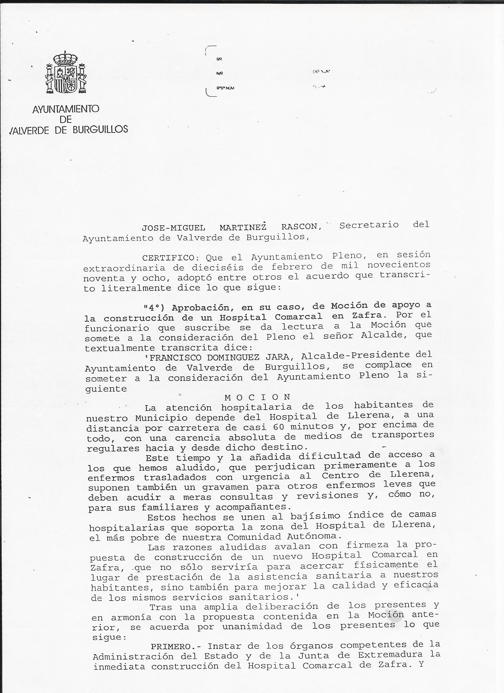 Documento del Ayuntamiento de Valverde de Burguillos al Proyecto del Hospital. Año 1998