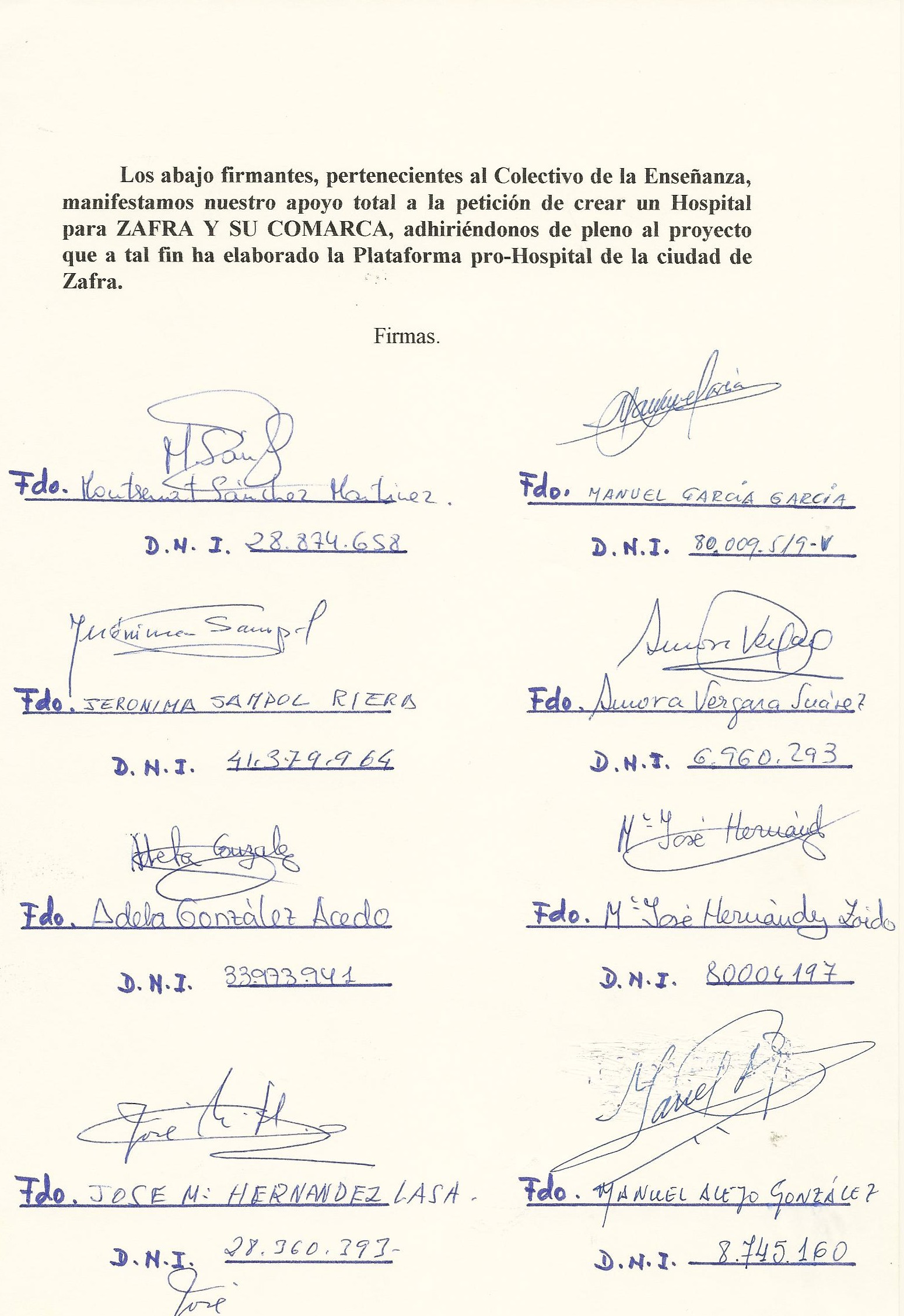 El proyecto del Hospital de Zafra fue apoyado por muchos sectores de la población en el Año 1998, lo cual fue muy importante para darle importancia y fuerza a los argumentos y poderlo enregar en las distintas administraciones para conseguir el Hospital para Zafra.