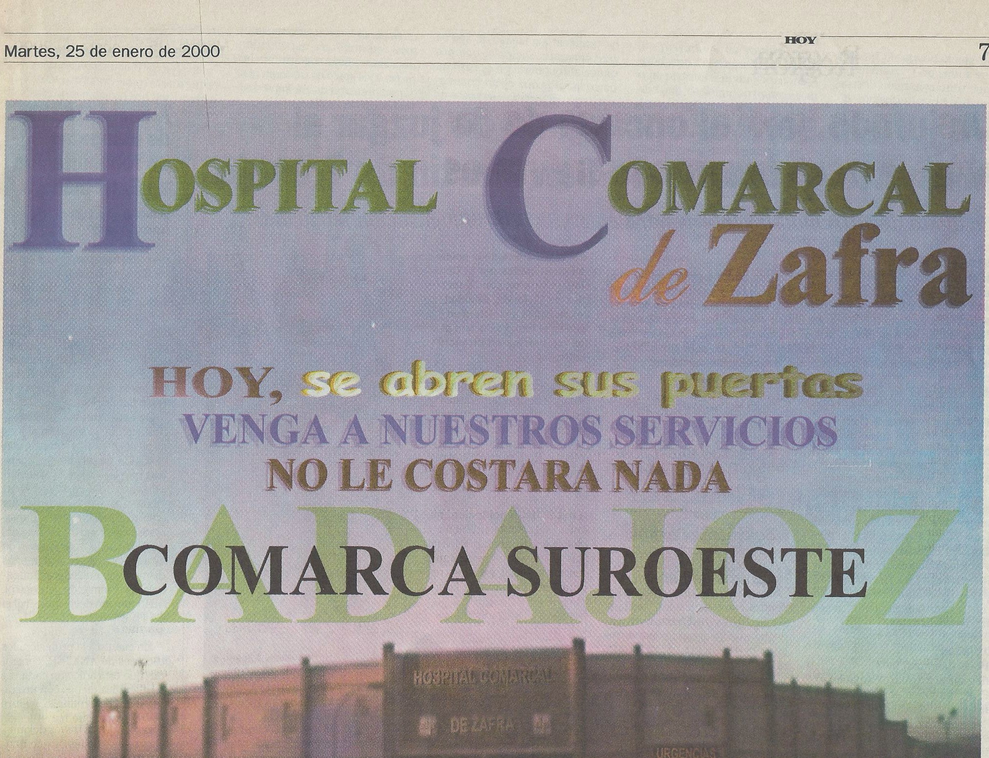 Publicación: Anuncio de la apertura del Hospital Comarcal de Zafra por la empresa José Manuel Pascual Pascual. Año 2000
