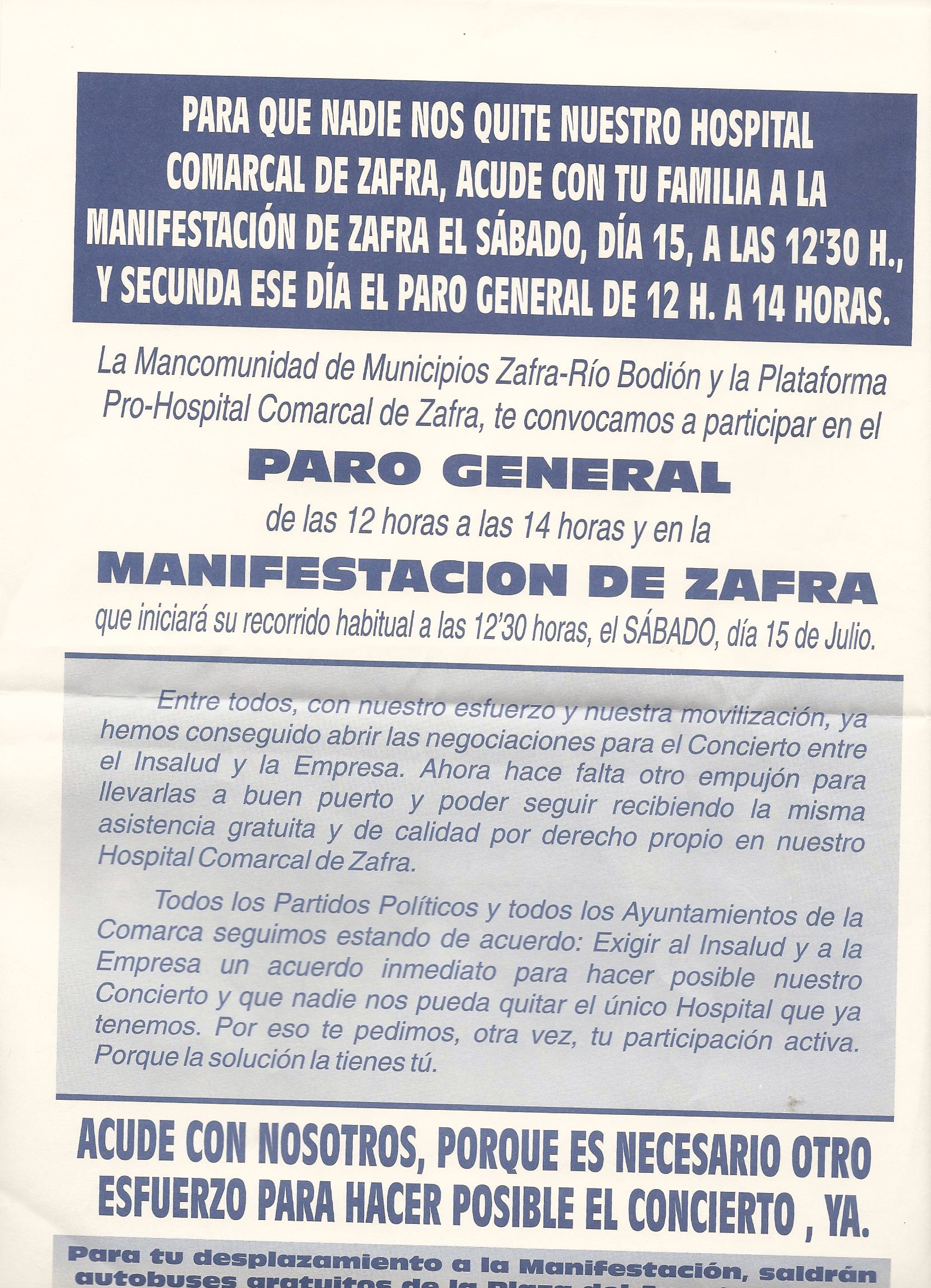 Hoja anunciando la manifestación para solicitar el concierto con el Hospital Privado de Zafra de la empresa Pascual
