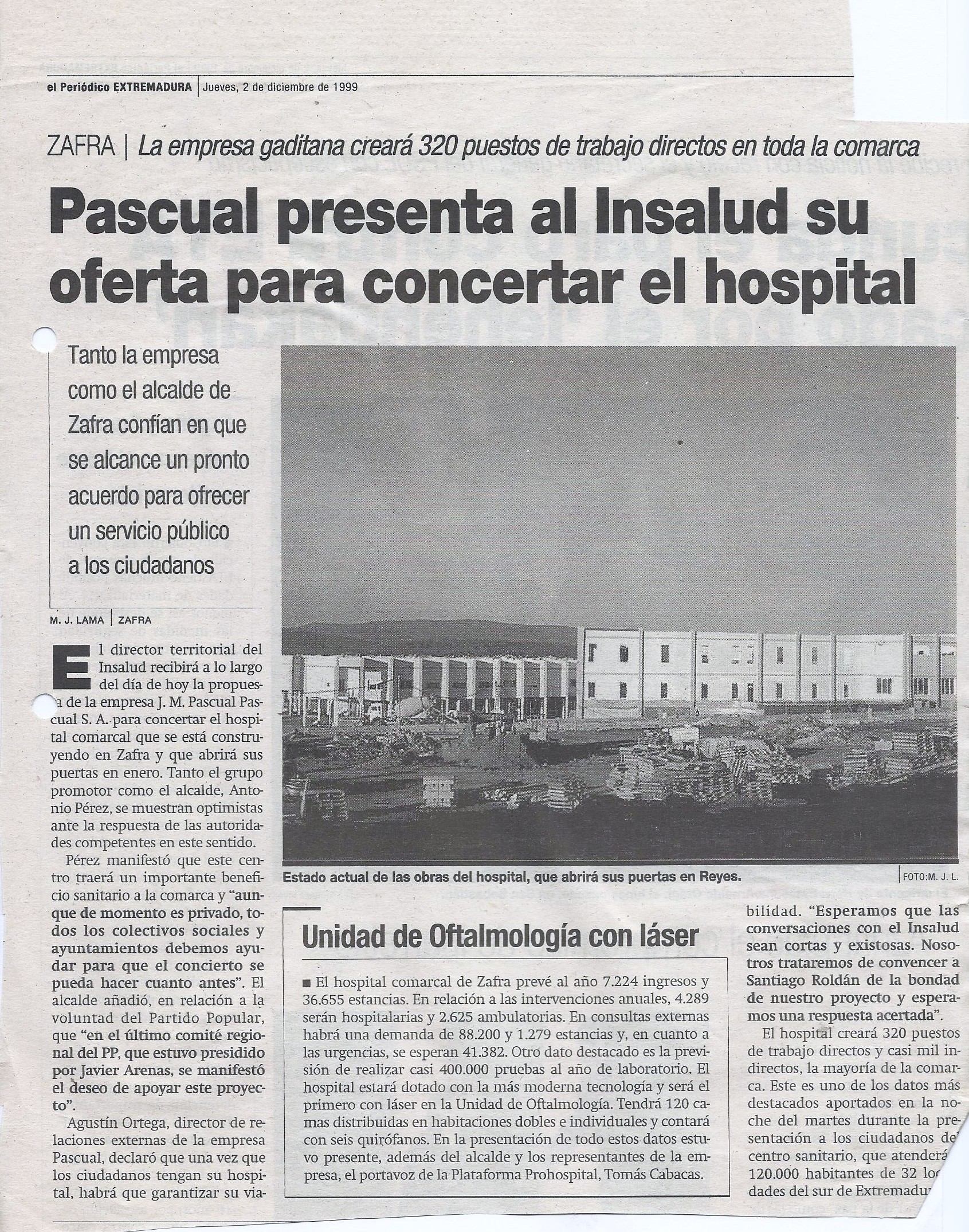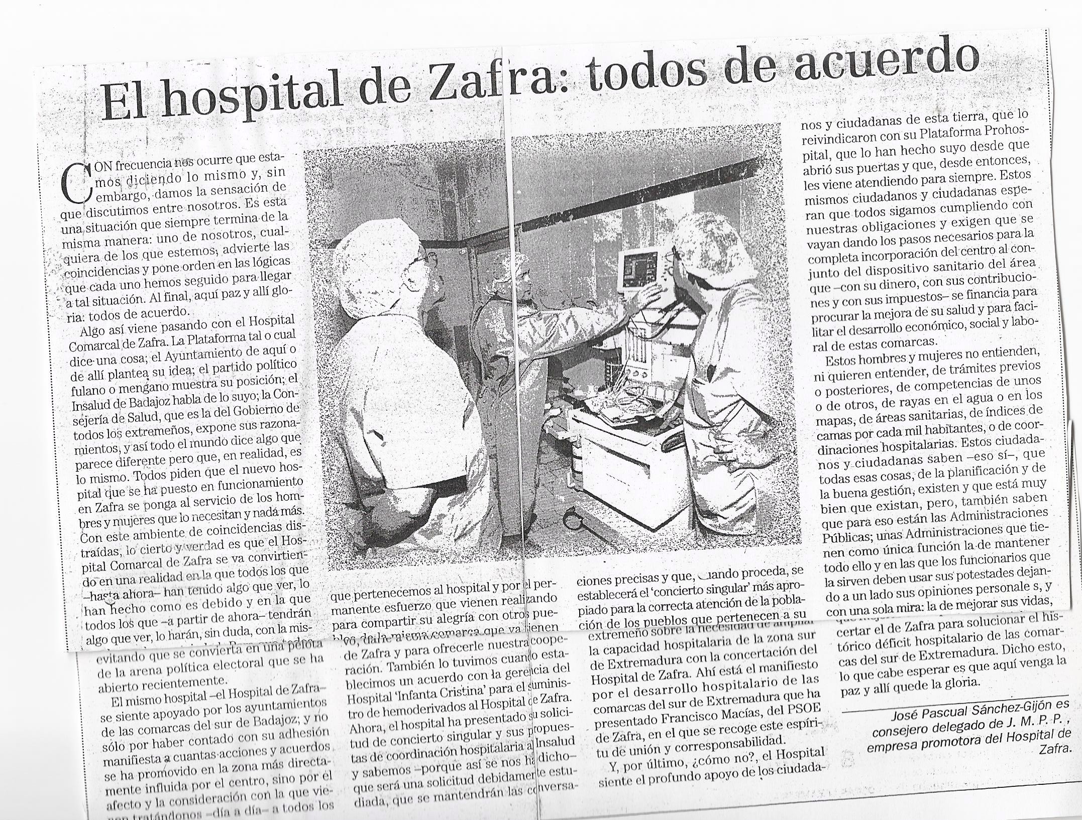 Publicación del Periodico Regional HOY del Hospital de Zafra y la Empresa Pascual. Publicado en primera página el dia 25 de enero del año 2000.