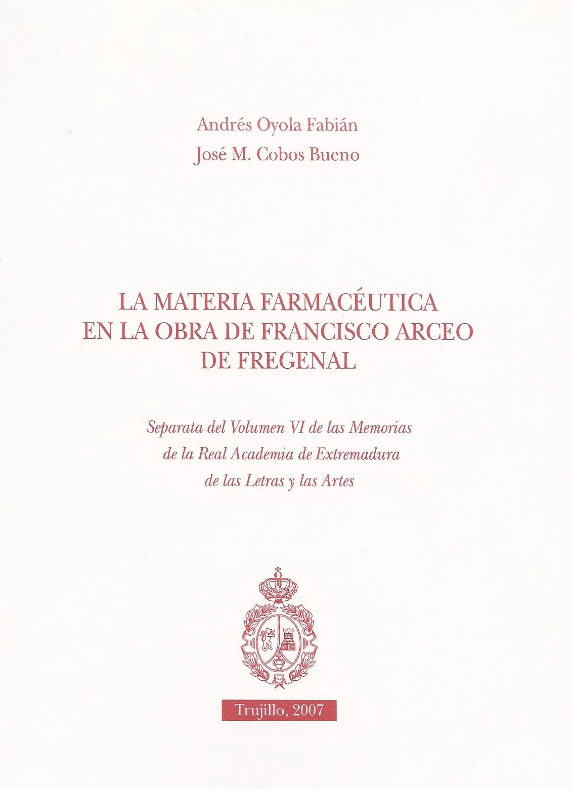 La materia farmacéutica en la obra de Francisco de Arceo de Fregenal Deja un comentario La materia farmacéutica en la obra de Francisco de Arceo de Fregenal Autor: Andrés Oyola y José M. Cobos Edita Real Academia de Extremadura Año 2007.