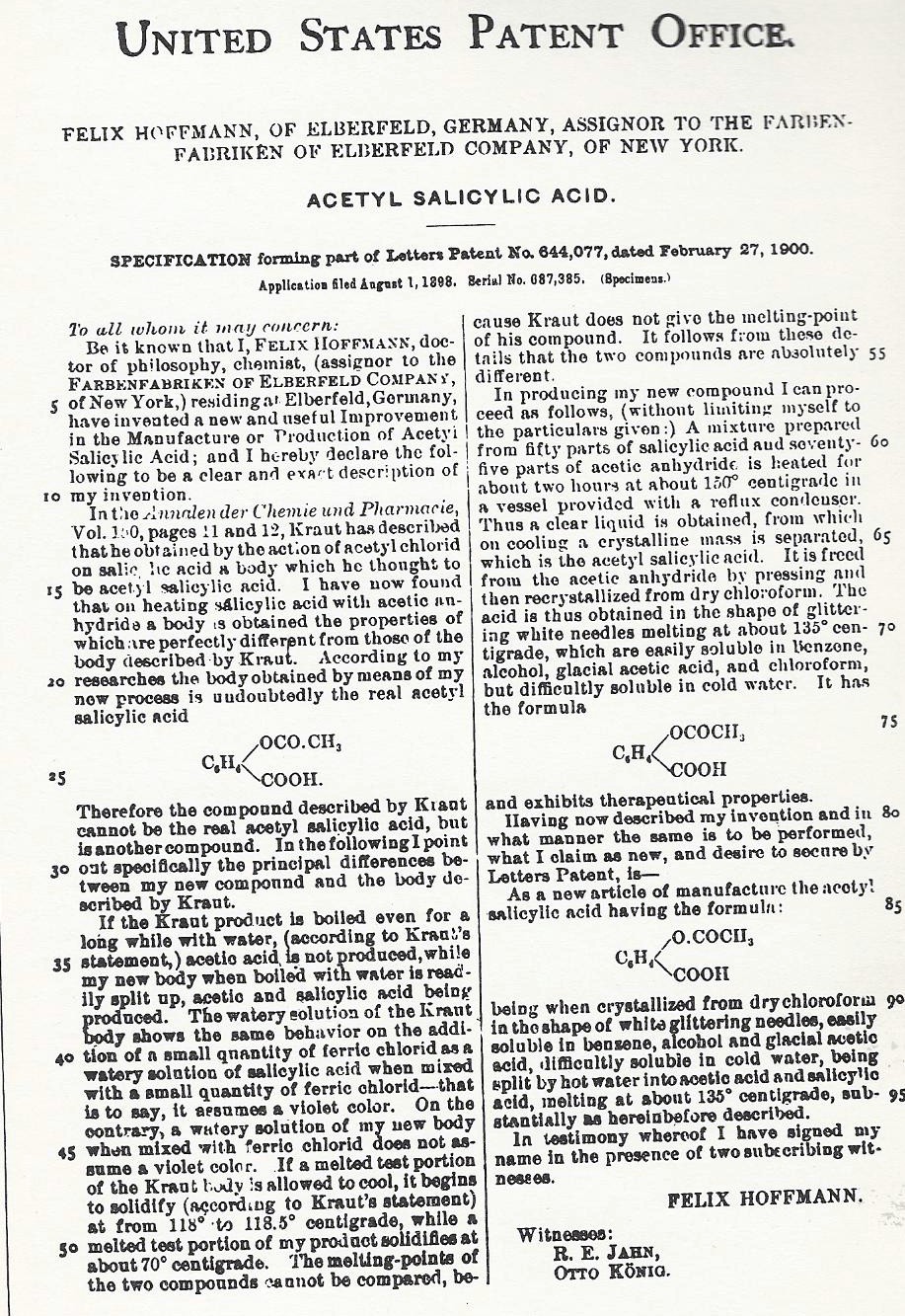 Félix Hoffman en 1984 retomó los trabajos de Charles Frederic Gerhardt que en 1953 inducjo una reacción entre cloruro de acetilo y salicitato sodico. Este quimico francés murio joven a los 40 años y Hoffaman investigó este compuesto como linea de investigación del Laboratorio Bayer y para poder una artritis que sufria su padre.