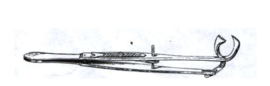 Es una pinza que las ramas tenían un curva hacía adentro y los bordes eran rectos, pero finamente dentados. En la zona central tenía un tornillo para fijar la presión de las pinzas y un resorte para asegurar y fijar la presión.