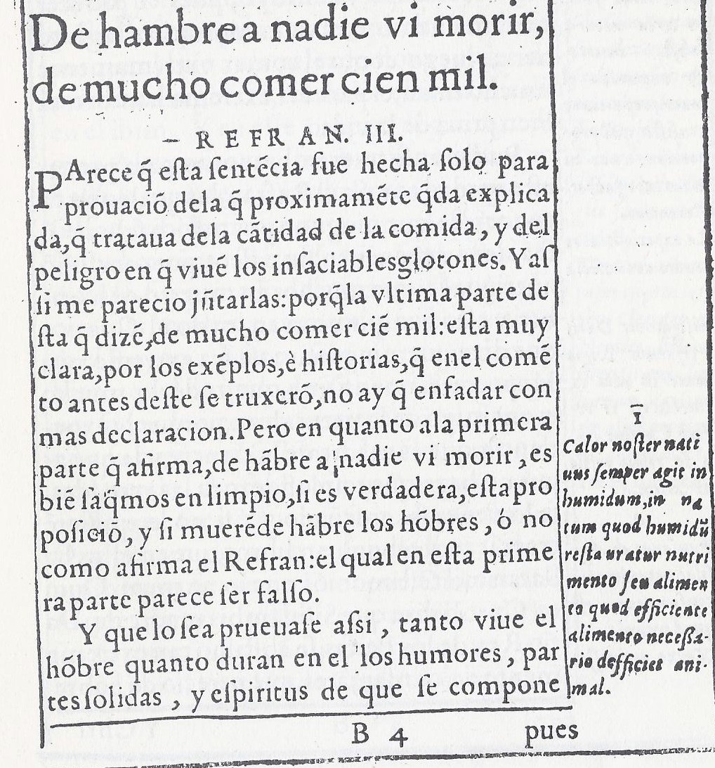 Parece que esta sentencia fue hecha solo para probar que la que próximamente queda explicada, que trataba de la cantidad de la comida y del peligro en que viven los insaciables glotones. Y así me pareció juntarlas porque la última parte de esta que dice “de mucho comer cien mil” está muy clara, por los ejemplos e historias que comentó, antes de este se trajeron no hay que molestar con más declaración. Pero en cuanto a la primera parte que afirma “De hambre a nadie vi morir”, es bueno que saquemos en limpio, si es verdadera esta preposición y si mueren de hambre los hombres o no, como afirma el refrán el cual en esta primera parte parece ser falso.