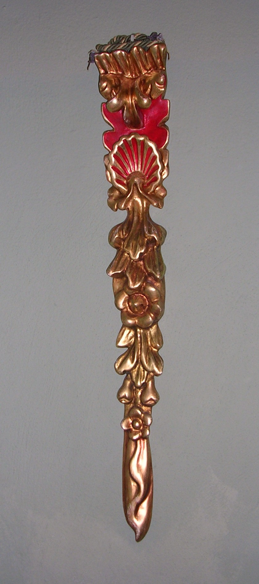 Tabla dorada del Siglo XVII. Restos del retablo de una iglesia de un pueblo cercano. Se realizaron reformas en la Iglesia y al reacomodar el retablo original no cabian ciertas tablas que se quedaron en el taller de los doradores Hermanos Carrasco de Zafra.