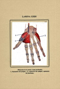 Disección de la mano derecha y cara palmar realizada por D. Clemente García Luquero en el año 1916 en la Facultad de Medicina de Madrid