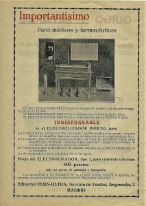 Electrolizador Prieto servia para potabilizar el agua por electricidad y fabricacion de lejias. Para la obtencion del licor Dakin. Para desinfección de los Hospitales. En veterinaria para desinfección de los estrablos. En los Ayuntamiento para la potabilización de las aguas.