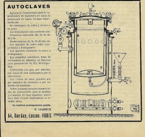 Autoclave Chamberland para la esterilización de materiales de cura mediante producción de vapor y agua esterilizada. Se construían en cobre, bronce y acero. Diametros interiores de 20,25, 34, 40, 45 y 50 cms. Funcionaban con gas, petroleo, vapor de aire carburado o electricidad