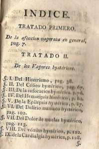 Tratado primero: “De la afección vaporosa en general” y Tratado II: “De los vapores histéricos”