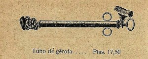 Tubo de Gerota que servia para realizar taponamientos con gasas o algodon. Era un tubo hueco largo que mediante una varilla que tenia en su extremo una semi esfera ajustable al tubo para penetrar el algodon.