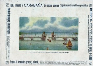 Puente de la Isla de Cortegada con publicidad de medicamentos. Año 1916