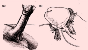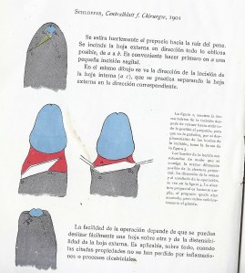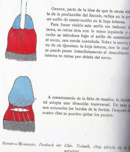 La circuncisión según el método de Omer Márquez. Realiza el mismo procedimiento que Ricord en el año 1856 sino que secciona el prepucio dentro de la hendidura de la pinza
