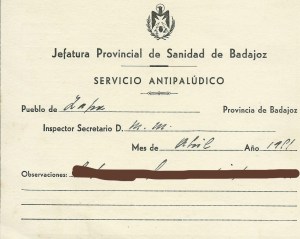 Ficha Antipalúdica ordenada por la Jefatura Provincial de Sanidad de Badajoz en el año 1931