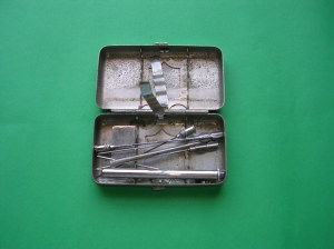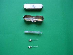 Caja metálica pequeña con jeringa para inyecciones a domicilio. Contiene jeringa de cristal y dos agujas metálicas