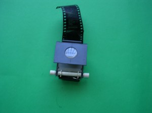 Visor de microfilms. Consiste en un artefacto pequeño que consta de una placa que contiene una lupa de 2 cms y dos rodillos dentados para girar la película que tiene sus márgenes dentados que se acoplan a los rodillos de esta forma se pasaban los fotogramas para visualizarlos en la lupa de la placa.