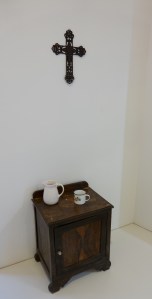 La vitrina segunda tiene los instrumentos para la lucha contra la infección. Jabón, cepillo, guantes, calor etc.