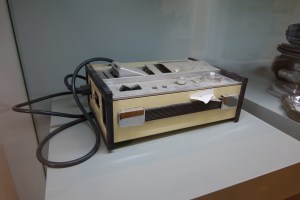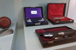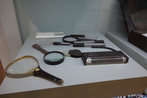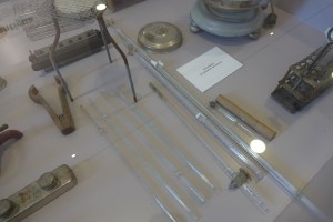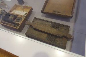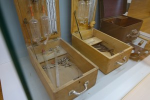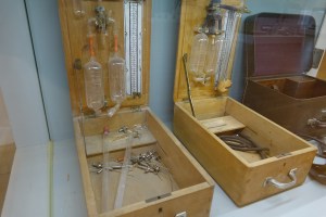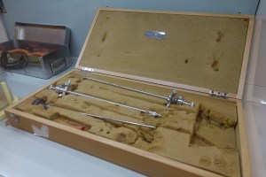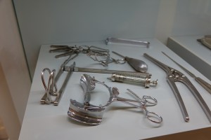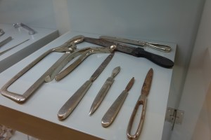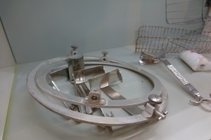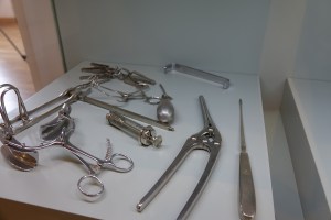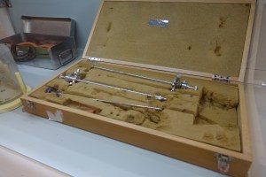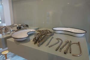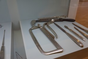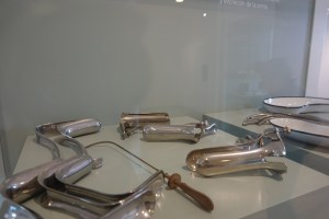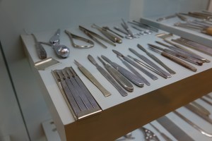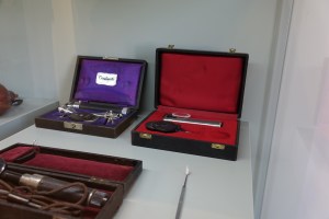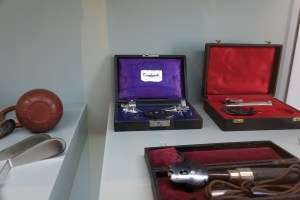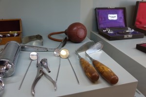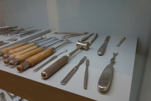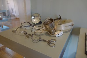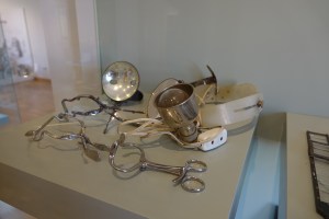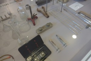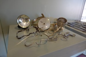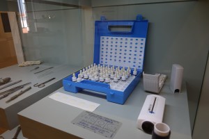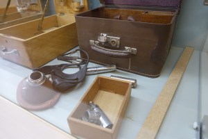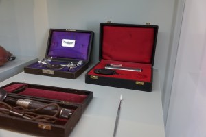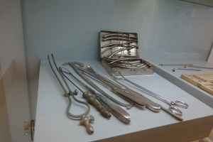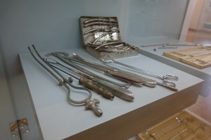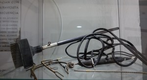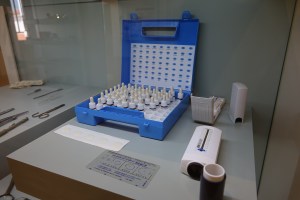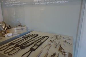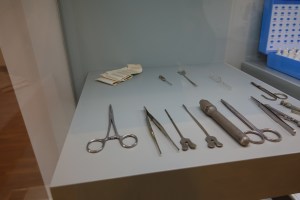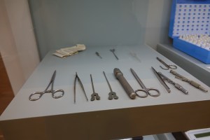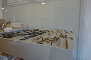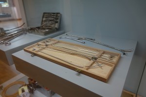 Vitrina donde se encuentran los instrumentos que sirvieron para resolver las hemorragias. Gasas. Hilos de alambre, cobre, estaño, catgut, seda, hilo etc
