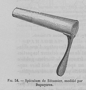 Jaccoud, Sigismond François en la obra “Nuevo Diccionario de medicina y cirugía” publicado en 1882 se refiere a la modificación del mango en el espéculo de J. Recamier por G. Dupuytren.