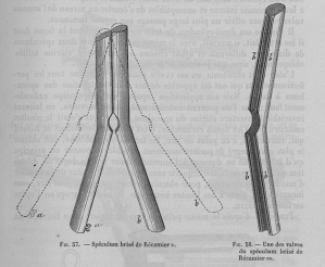 Jaccoud, Sigismond François en la obra “Nuevo Diccionario de medicina y cirugía” en el Volumen 33. Publicado en Paris en 1882 por JB. Baillére dibuja y describe un espéculo de J. Recamier de dos ramas.