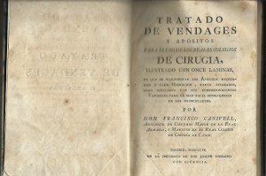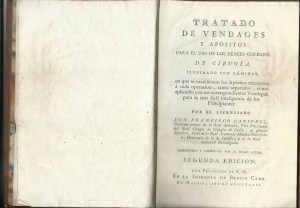Libro el «Tratado de Vendages y Apósitos» . Año 1786, cuyo titulo completo es: «Tratado de Vendages y Apósitos para el uso de los Reales Colegios de Cirugía». y continua el autor explicitando en la portada «En que se manifiestan los apósitos necesarios para cada operación, tanto separados, como aplicados con sus correspondientes vendages, para la más fácil inteligencia de los principiantes.»