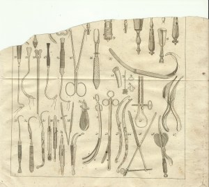 Instrumentos médicos para la traqueotomía y las hernias en el siglo XIX de la lámina IV de la traducción de la obra «Manual de Medicina Operatoria» (1834) de J.F. Malgaigne realizada por D. Cayetano Balseiro, se publica en el año 1841 e inserta un Atlas de 11 láminas de los instrumentos médicos al final del primer tomo.