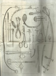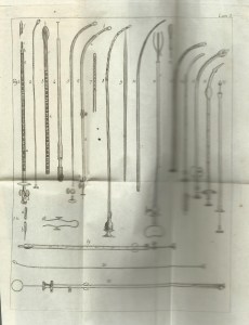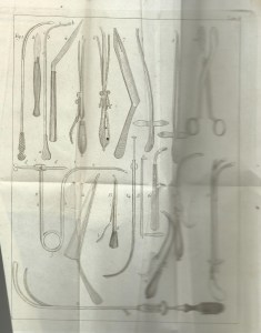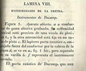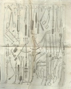 Instrumentos médicos para la traqueotomía y las hernias en el siglo XIX de la lámina IV de la traducción de la obra «Manual de Medicina Operatoria» (1834) de J.F. Malgaigne realizada por D. Cayetano Balseiro, se publica en el año 1841 e inserta un Atlas de 11 láminas de los instrumentos médicos al final del primer tomo.