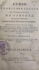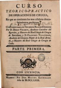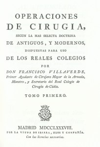 He recogido y transcribo literalmente los conocimientos que expone Francisco Villaverde, Cirujano de la Armada Española y Secretario del Colegio de Cirugía de Cádiz en su obra “Operaciones de Cirugía” , que fue libro de texto en los Reales Colegios de Cirugía y en muchas universidades de España.