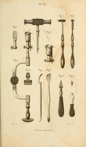 Instrumentos quirúrgicos para craneotomía en el Siglo XIX ”. Están en un grabado de la obra “Médecine Opératoire” de Cl. Bernard y Ch. Huette. El titulo original es «Précis iconographique de Médecine Opératoire et d´anatomie chirurgicale». Año 1846