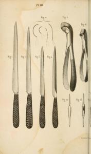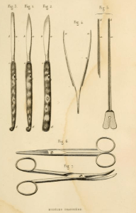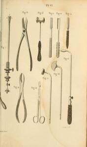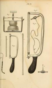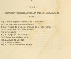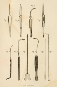 Instrumentos médicos para intervenciones quirúrgicas de los oidos en el Siglo XIX. Están en un grabado de la obra “Médecine Opératoire” de Cl. Bernard y Ch. Huette. El titulo original es «Précis iconographique de Médecine Opératoire et d´anatomie chirurgicale». Año 1846
