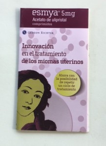 Dossier carpeta de cartón, tamaño folio, con publicidad del medicamento Esmya que se le entregaba a los médicos con información del medicamento.