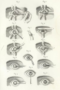 “ Intervención de cataratas. Año 1846  ” Es un grabado de la obra “Médecine Opératoire”  de Cl. Bernard y Ch. Huette. El titulo original es «Précis iconographique de Médecine Opératoire et d´anatomie chirurgicale».  Año 1846