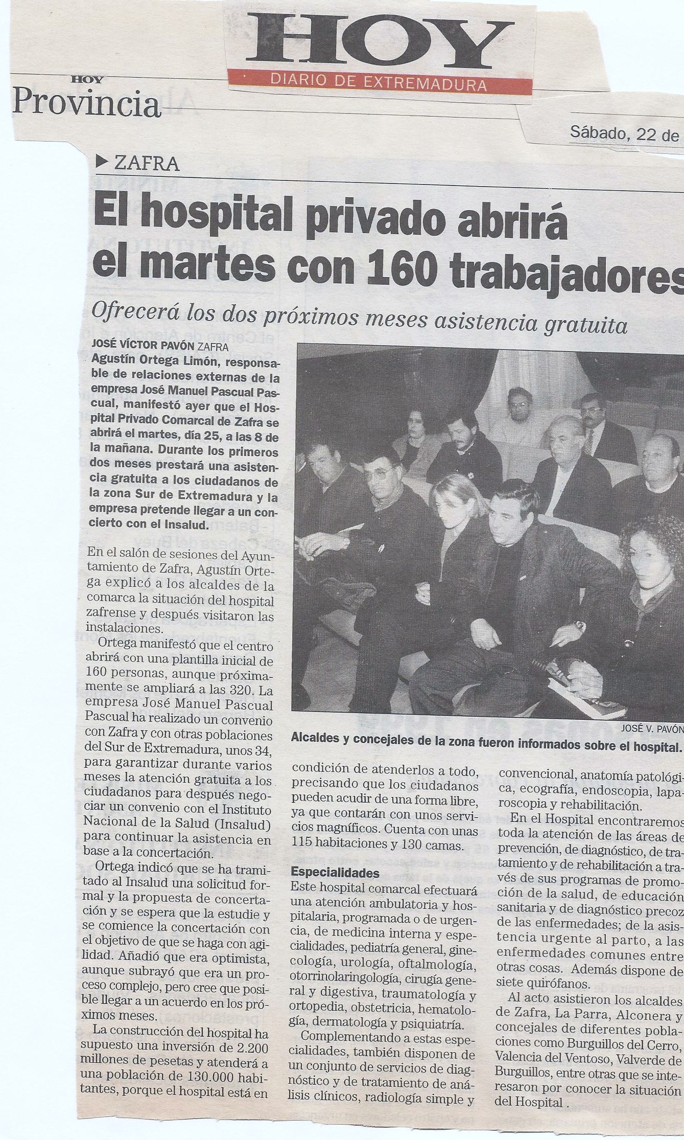 Articulo publicado en el Periodico Regional HOY por D. José Pascual Sánchez-Gijón de la empresa promotora del Hospital privado en Zafra en julio delaño 2000.