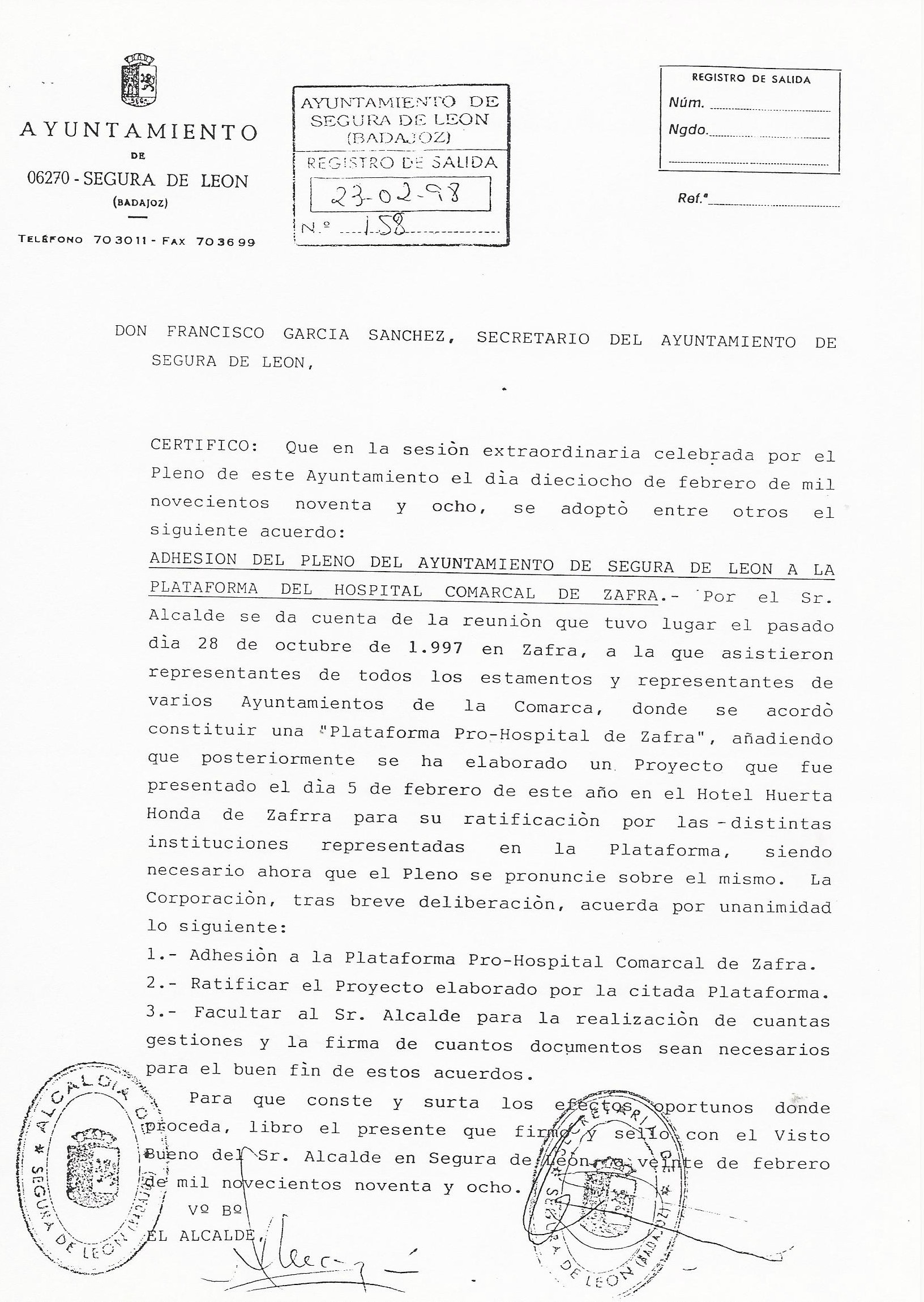 Documento del Ayuntamiento de Segura de Leon al Proyecto del Hospital. Año 1998